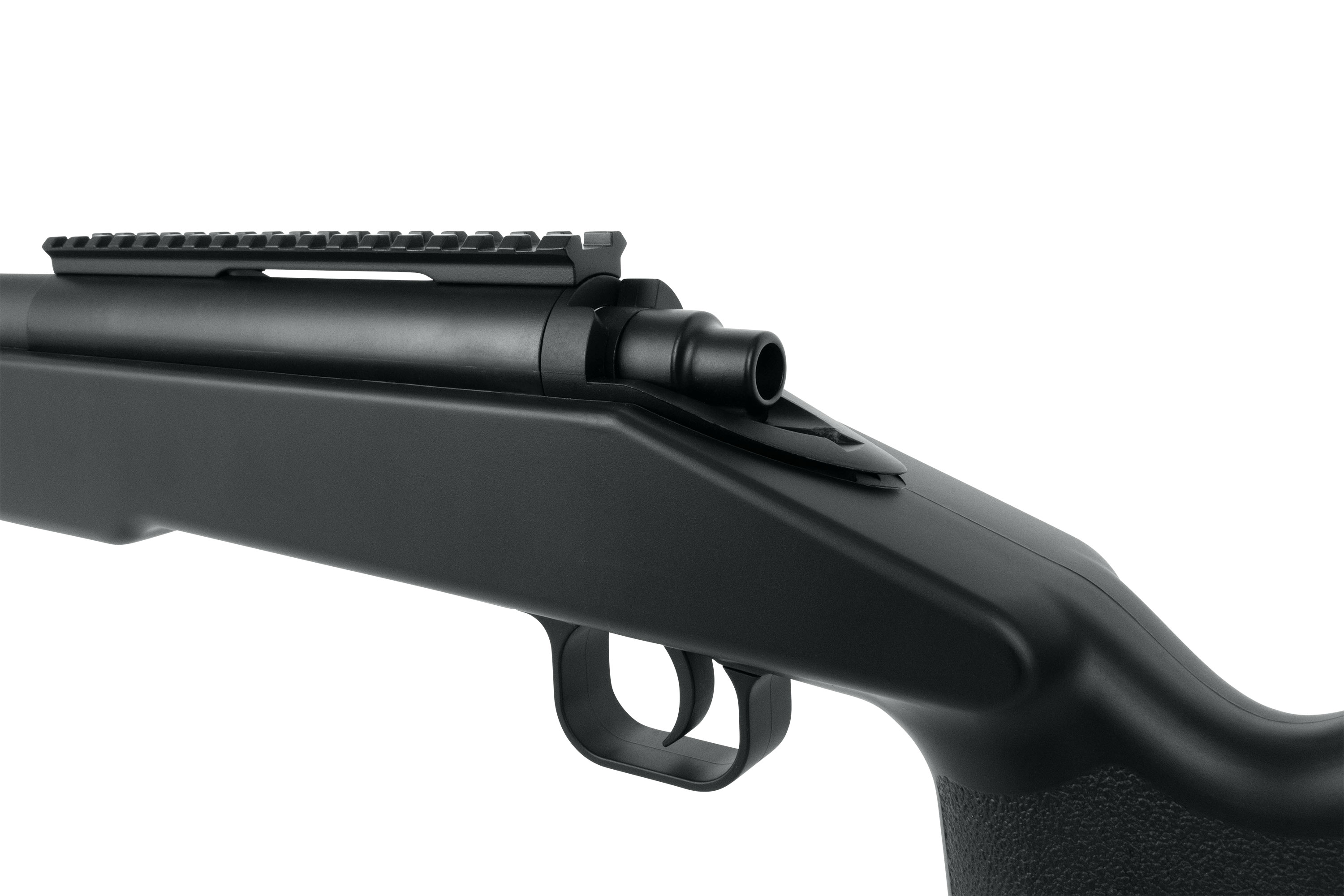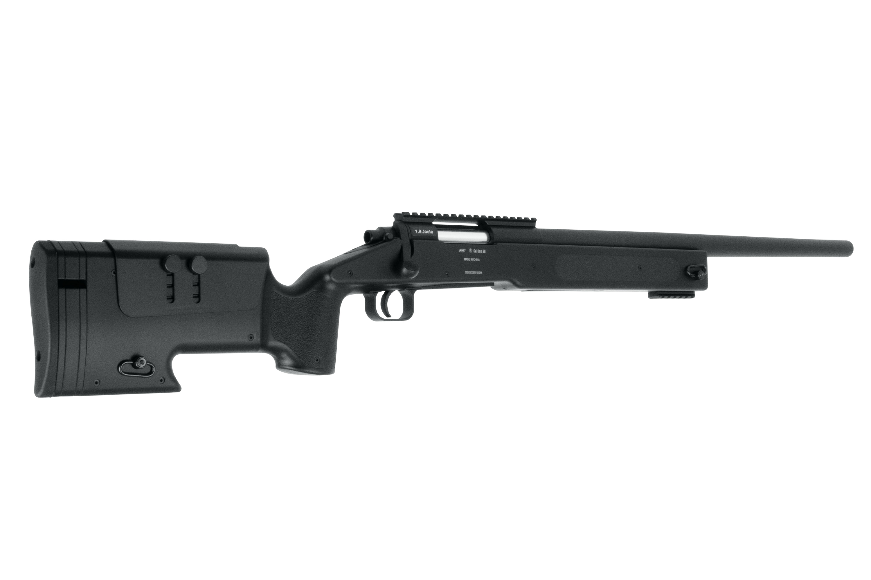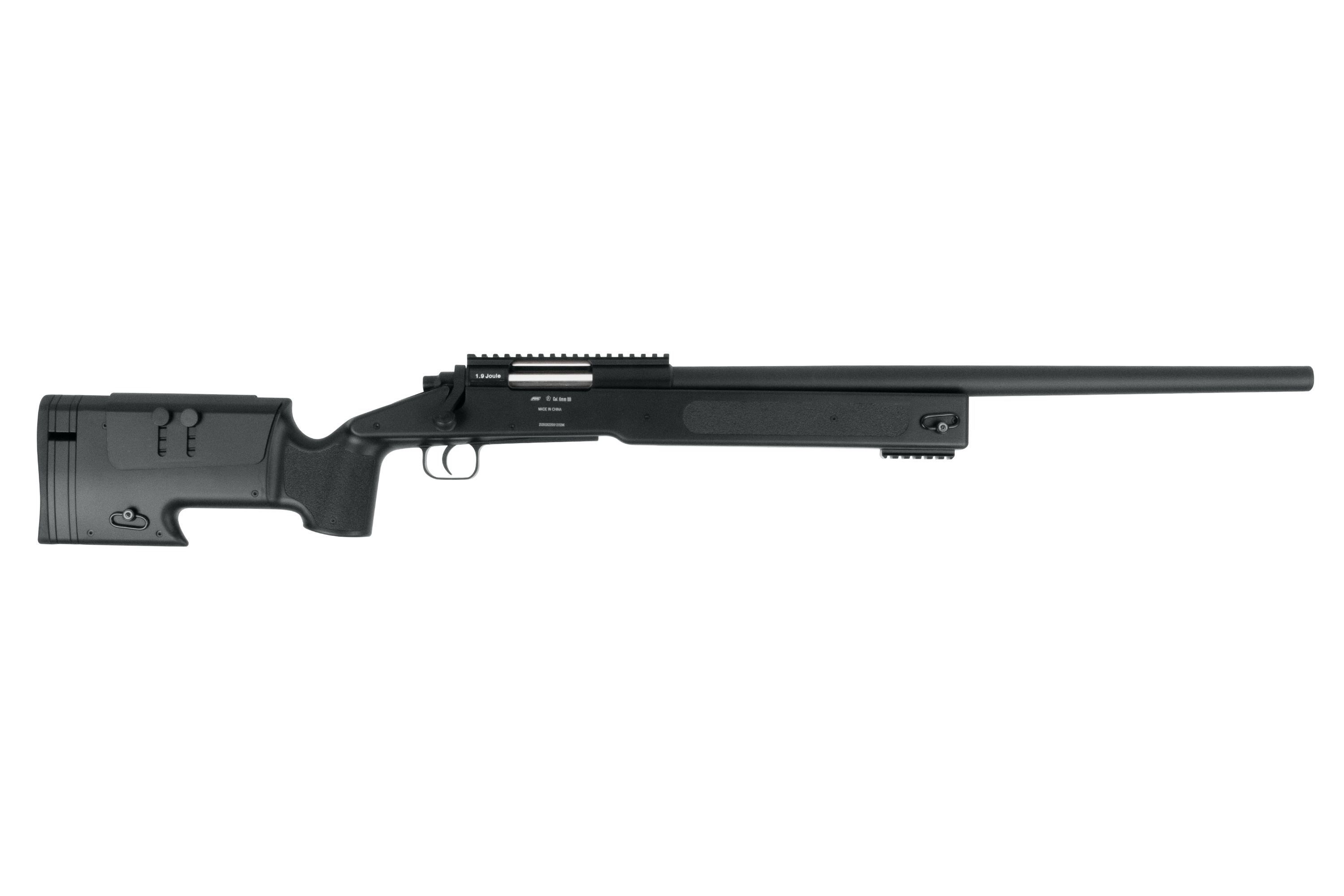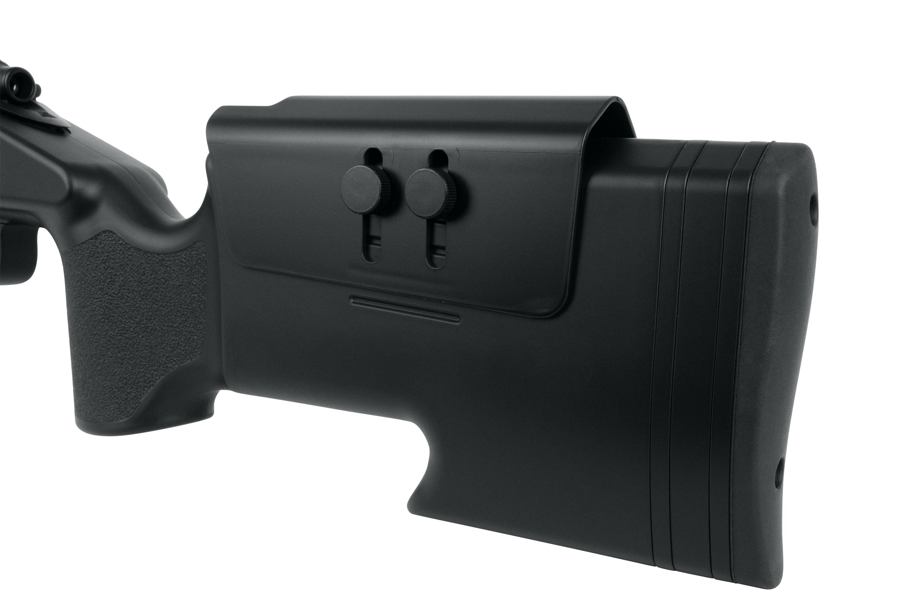 Der robuste Kunststoffschaft ist ergonomisch gestaltet und bietet strukturierte Griffbereiche für einen sicheren Halt. Ein einstellbares Hop-Up System ermöglicht eine kontrollierte Flugbahn der BBs auch auf größere Distanzen. Für eine individuelle Anpassung ist die Schulterauflage in der Länge verstellbar, ergänzt durch eine höhenverstellbare Wangenauflage und eine rutschfeste Gummischaftkappe.