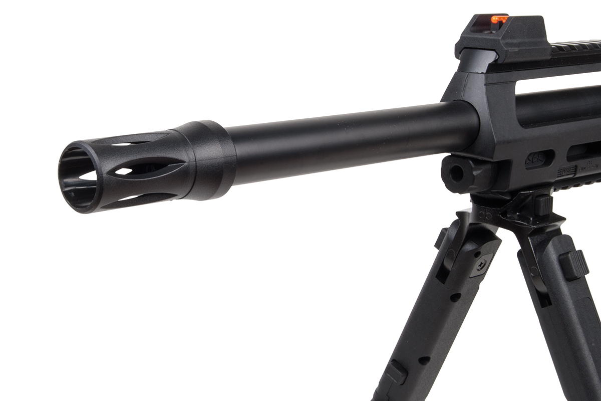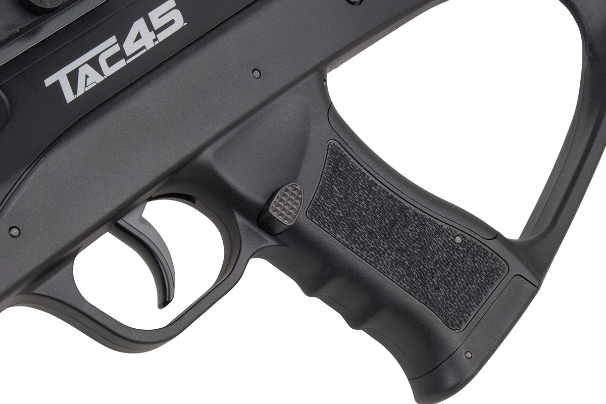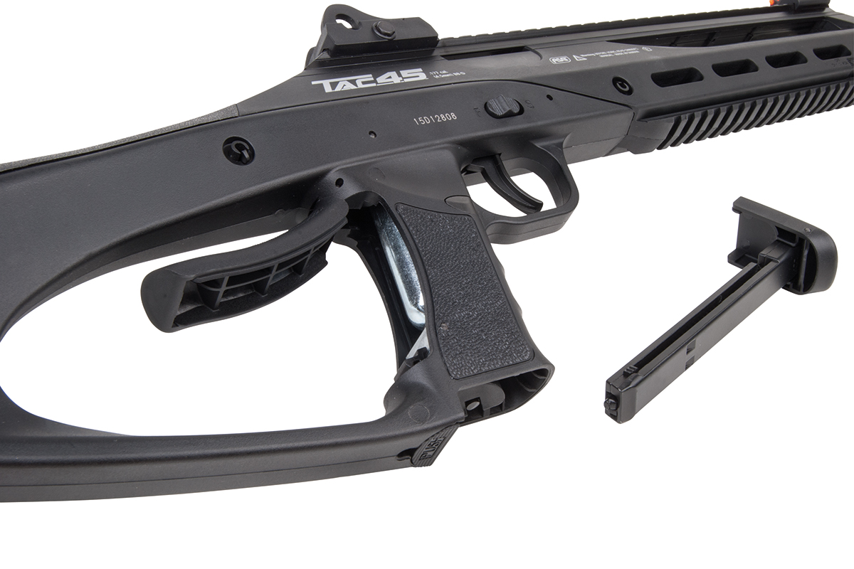 Das TAC 4.5 ist ein 21-schüssiges Luftgewehr mit einem hochwertigem Polymer-Body und einem Metall-Außenlauf im Sniper-Design. Das taktische Design ermöglicht dem Schützen eine Vielzahl an Variationsmöglichkeiten. Der ergonomische Lochschaft ist für Rechts- sowie Linksschützen geeignet. Durch das 21-Schuss Magazin ist ein langer Schießspaß vorprogrammiert. Das Model verfügt über zwei lange Railschienen, eine ventilierte Schaftkappe sowie eine abnehmbare Visierung. Die hintere Visierung ist zusätzlich einstellbar, vorne befindet sich ein Leuchtkorn. Ein einstellbares, klappbares Zweibein ist im Lieferumfang enthalten.