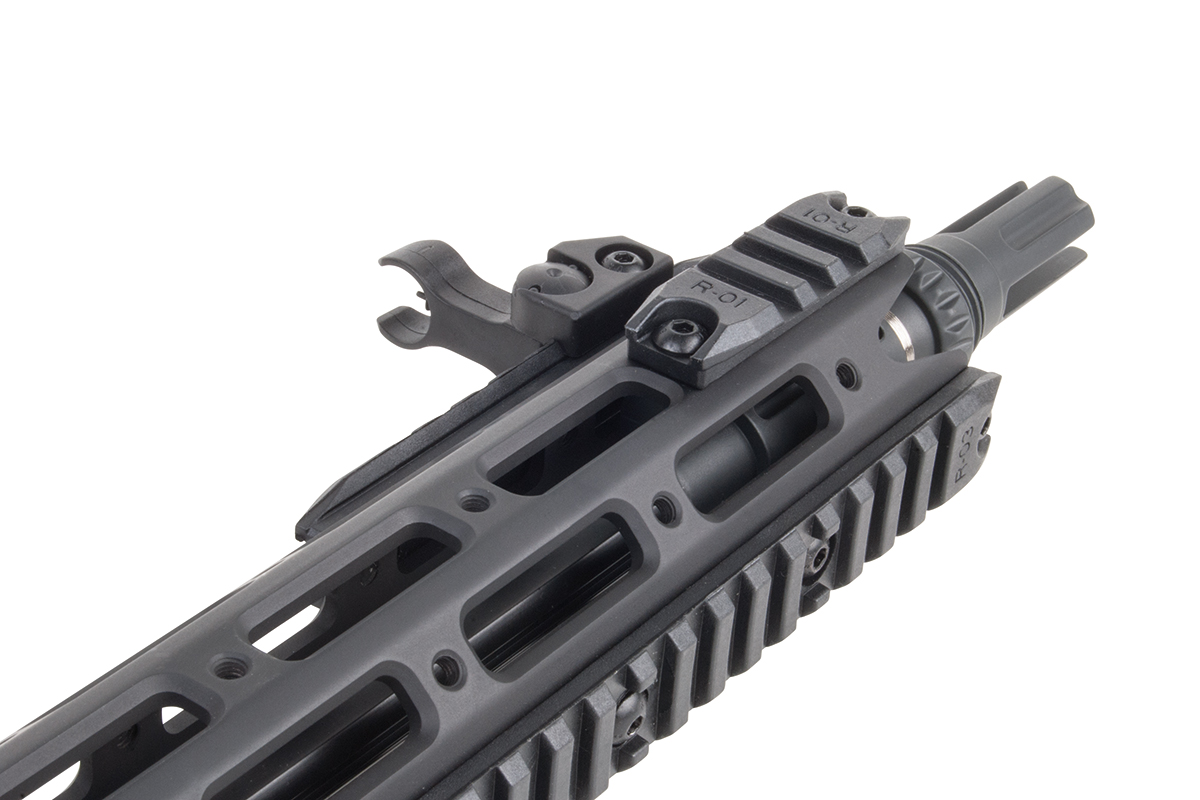 Die hochwertig verarbeitete S-AEG Waffe aus dem Hause ARES wird aus Nylon-Fiber gefertigt und ist Silencer-kompatibel. Sie verfügt über verschiedene Railschienen, einen Schiebeschaft, eine abnehmbare & einstellbare Visierung und ein einstellbares Spin-Up System.