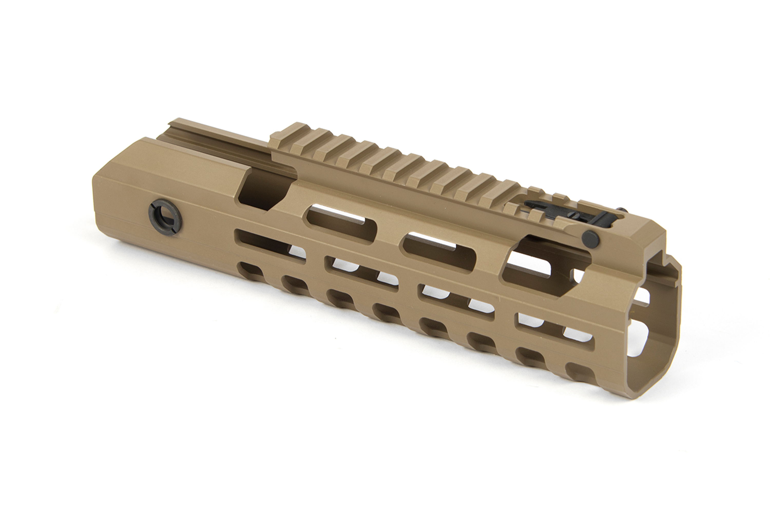 Langer Handguard mit M-LOK Öffnungen und kurzer Picatinnyschiene in der Farbe Dark Earth.