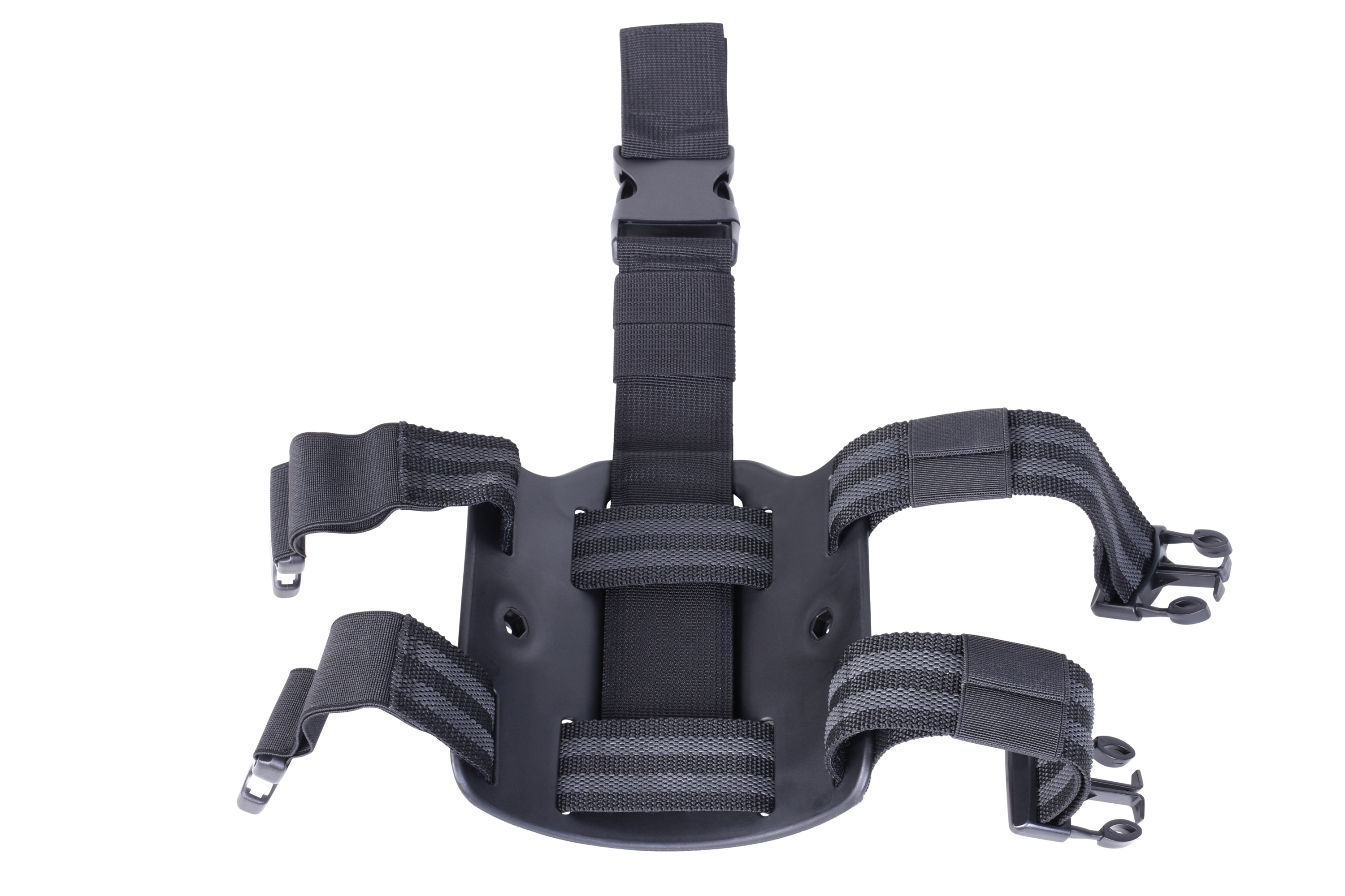 Sie bietet einen Schnellverschluss, breite, elastische Beingurte mit Gummierung, eine universale Roto-Aufnahme zur Montage von Holstern in jedem gewünschten Winkel und eine Gurtschlaufe mit doppeltem Klettverschluss. Sie ist höhenverstellbar und für Rechts- sowie Linkshänder geeignet.