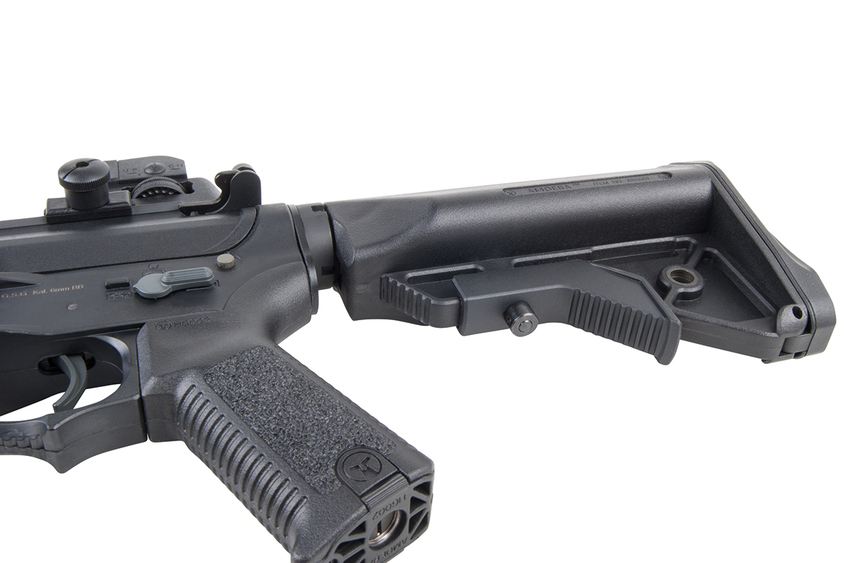 Die hochwertig verarbeitete AEG Waffe ist aus Nylon-Fiber gefertigt und ist Silencer-kompatibel. Sie bietet dir verschiedene Railschienen, einen Schiebeschaft, eine abnehmbare & einstellbare Visierung und ein einstellbares Spin-Up System. Dieses befindet sich unter dem Hülsenauswurffenster und kann sehr leicht eingestellt werden. Der abnehmbare Mündungfeuerdämpfer wird mit einem 13,5 mm Rechtsgewinde befestigt.