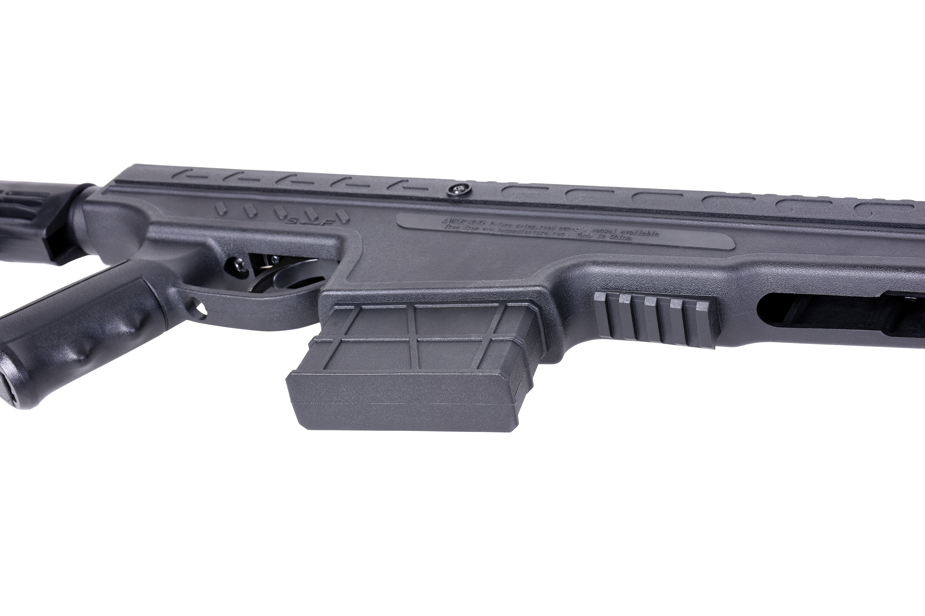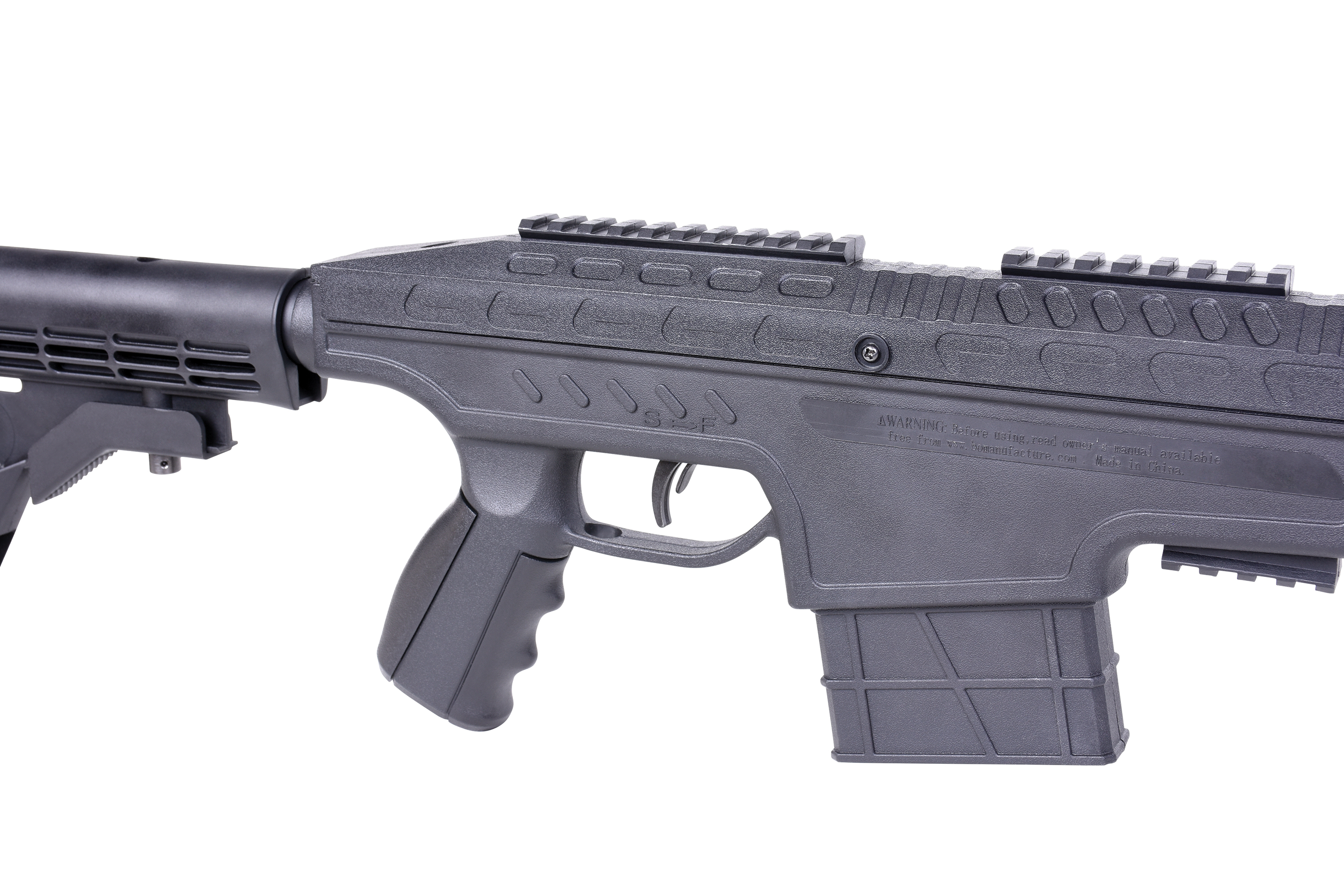 Das taktische Gewehr wird durch das Kippen des Laufes gespannt und verschießt jeweils ein 4,5mm Diabolo. Die Sicherung erfolgt manuell in Höhe des Abzugs.