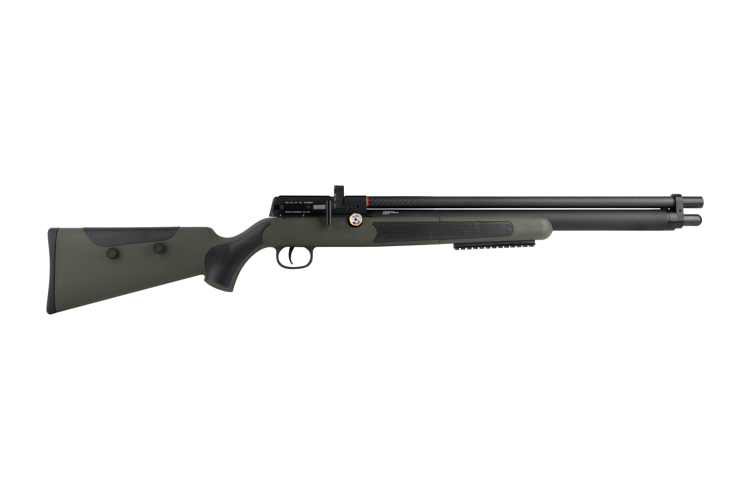Das rotierbare Manometer ermöglicht eine direkte Druckkontrolle während des Schießens, ohne den Blick vom Ziel zu nehmen. Ein zweites Manometer für den Regulatordruck befindet sich bequem erreichbar an der rechten Seite des Gewehrs.