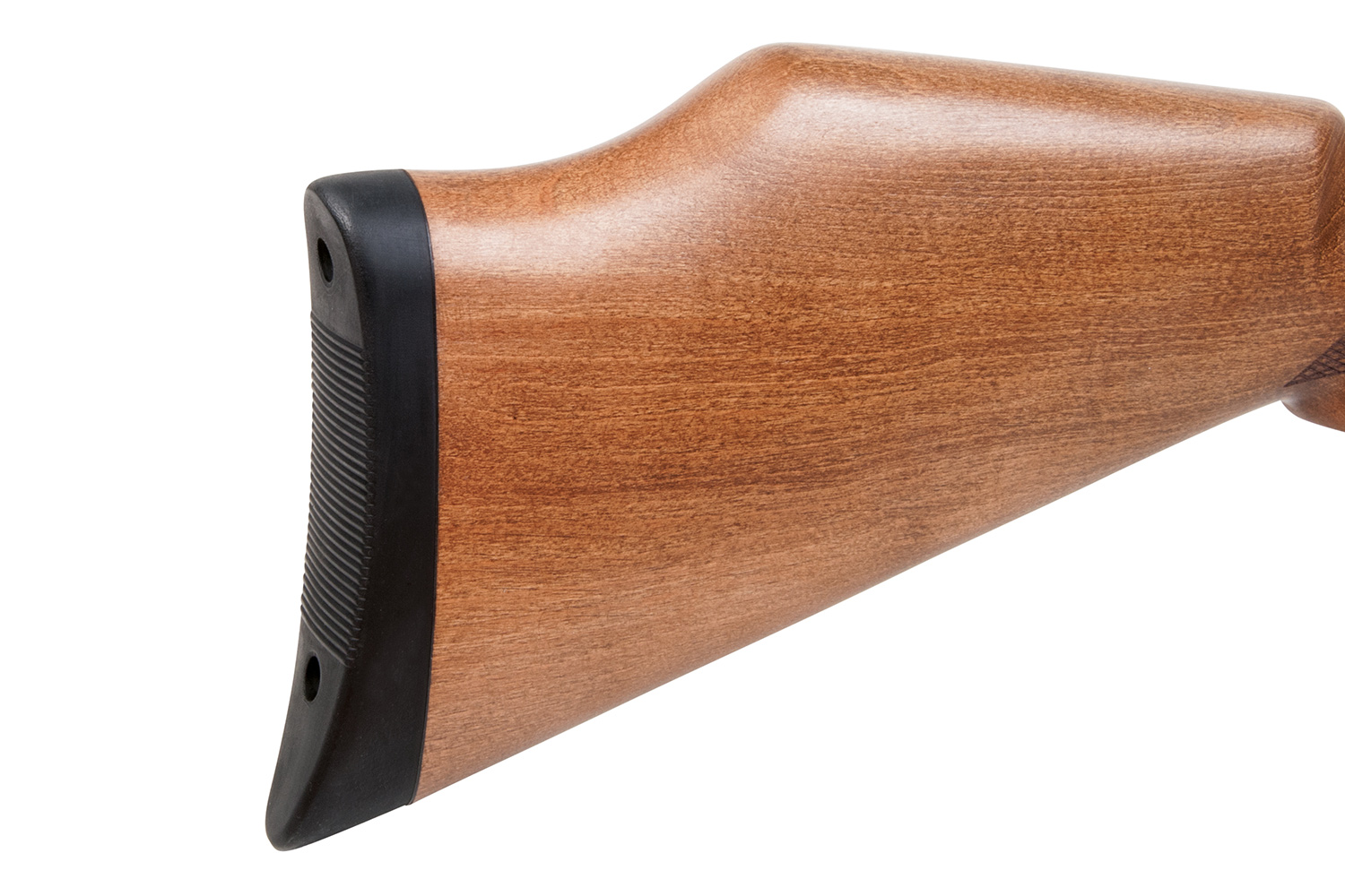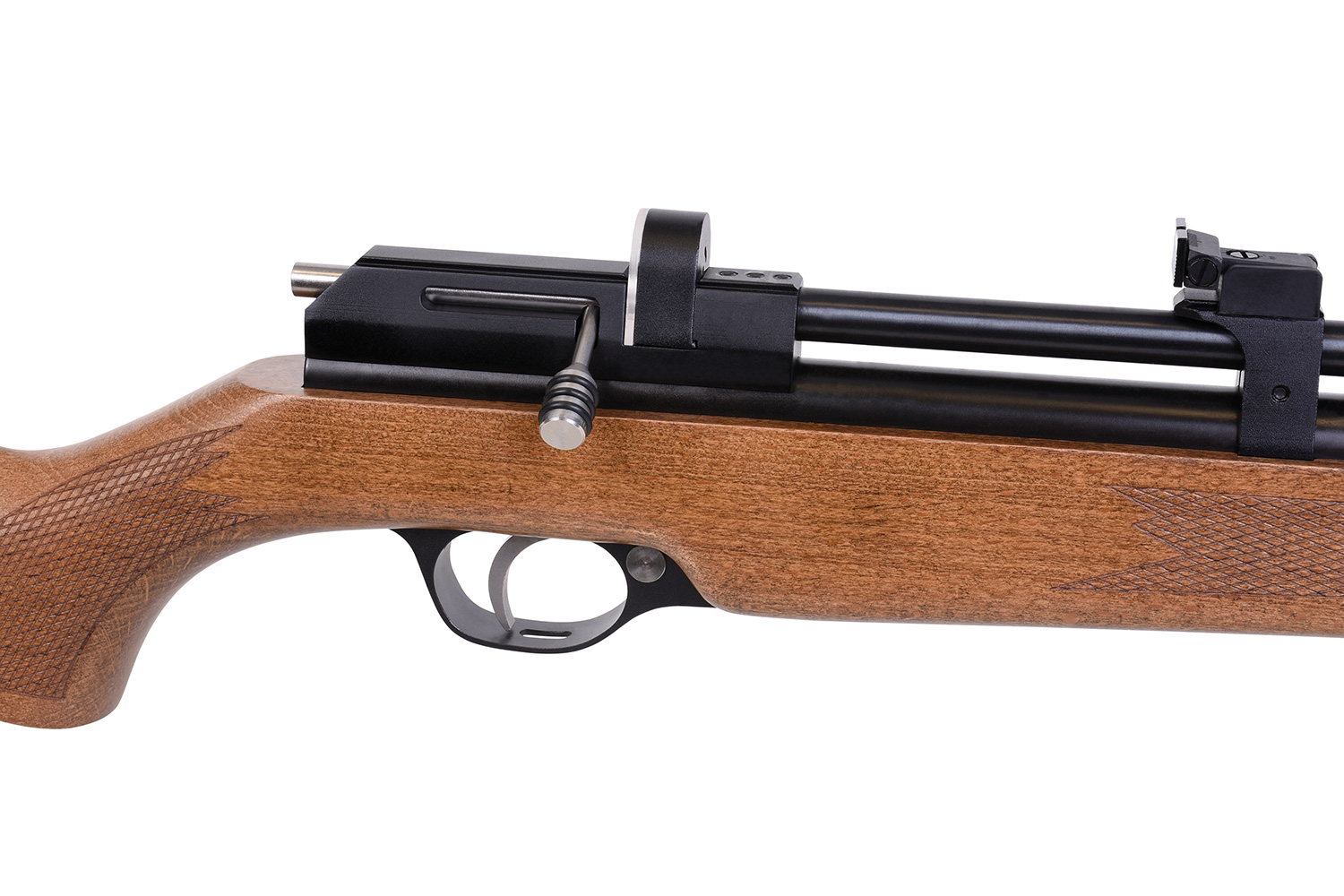 Das Modell verfügt über eine gefräste Prismenschiene, einen Schalldämpfer, eine einstellbare Mikrometer-Visierung, eine gummierte Schaftkappe und eine manuelle Sicherung.