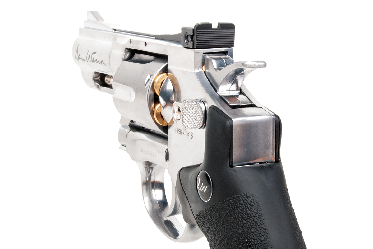 Der Revolver aus Vollmetall verfügt über einen Double Action Abzug, eine verstellbare hintere Visierung und robuste Kunststoffgriffschalen.