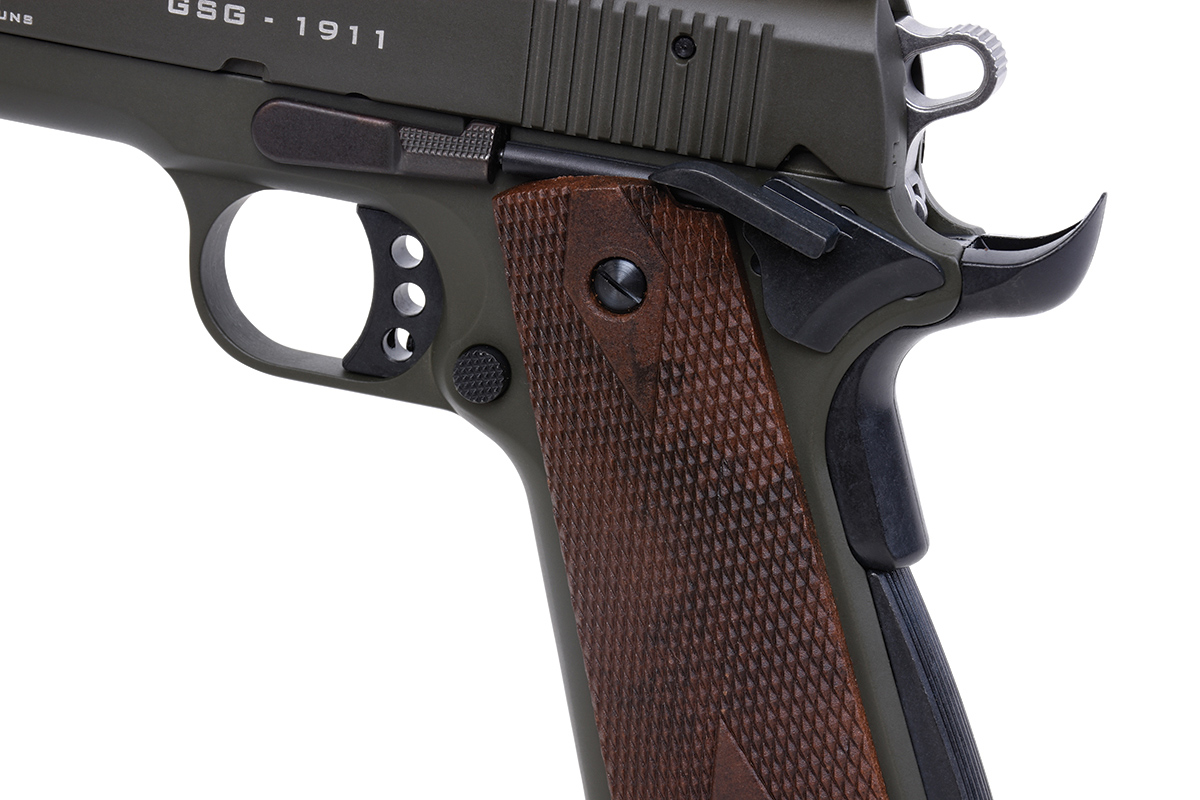 Die GSG 1911 besitzt ein Metallmagazin und kommt mit einer verstellbaren Visierung. Der Lauf ist ausgestattet mit einem Mündungsgewinde M9x0.75.