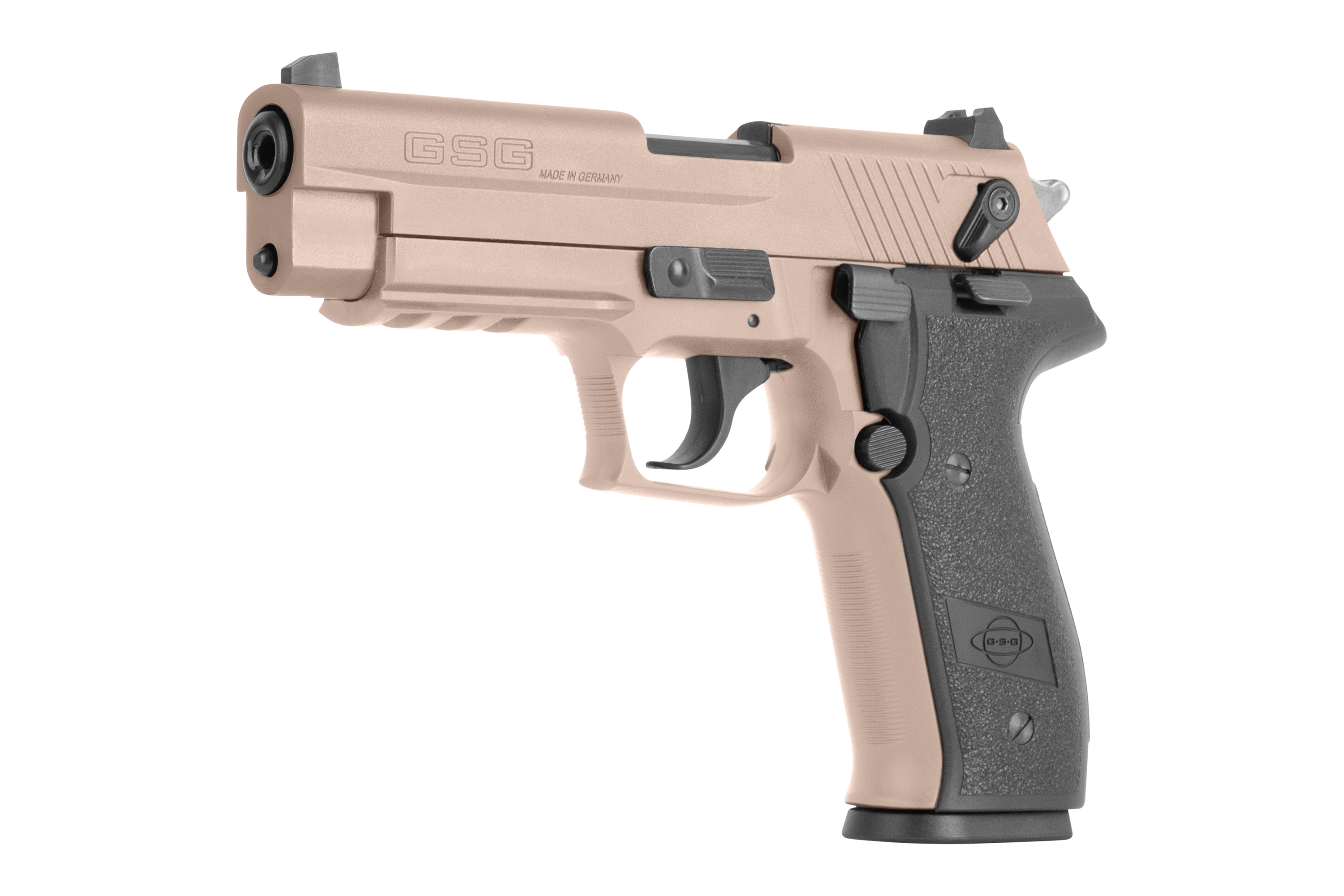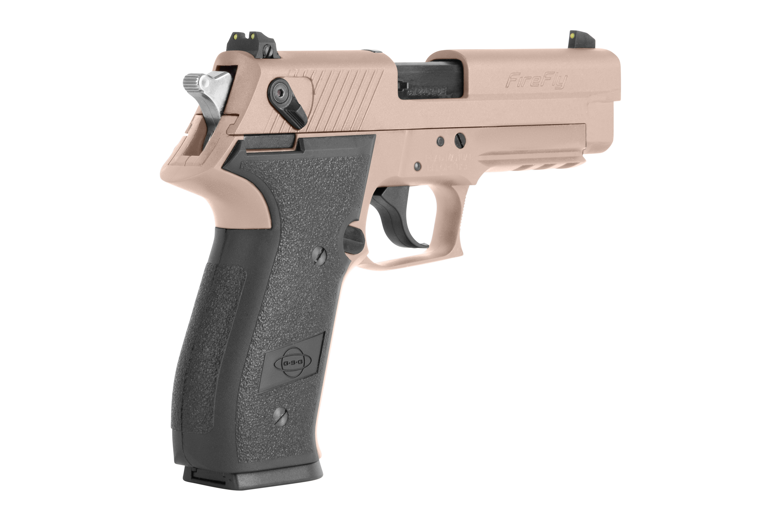 Die GSG Firefly ist eine um 10% verkleinerte Selbstladepistole im Design einer SIG SAUER P226 im Kaliber .22lr mit gleichem System und gleichen Sicherheitsfunktionen. Lediglich im Verschluss unterscheidet Sie sich vom großen Bruder, hier arbeitet ein Masseverschluss (Blowback-System). Ausgestattet mit einem ergonomischen Polymer Griffstück und schwarzen Kunststoff Griffschalen, Single – und Double-Action Abzug, Picatinny-Schiene zur Anbringung von Laser oder Brückenmontage, Metallmagazin, beidseitiger Flügelsicherung, Entspannhebel und einstellbarer Visierung. Zusätzlich ist die GSG Firefly ausgestattet mit einer Magazinsicherung sowie einer Kindersicherung, die sich mit einem beiliegenden Schlüssel aktivieren bzw. deaktivieren lässt. Beliebt bei Sportschützen aber auch bei Jägern als universelle und preisgünstige Fangschusswaffe zur Fallenjagd.