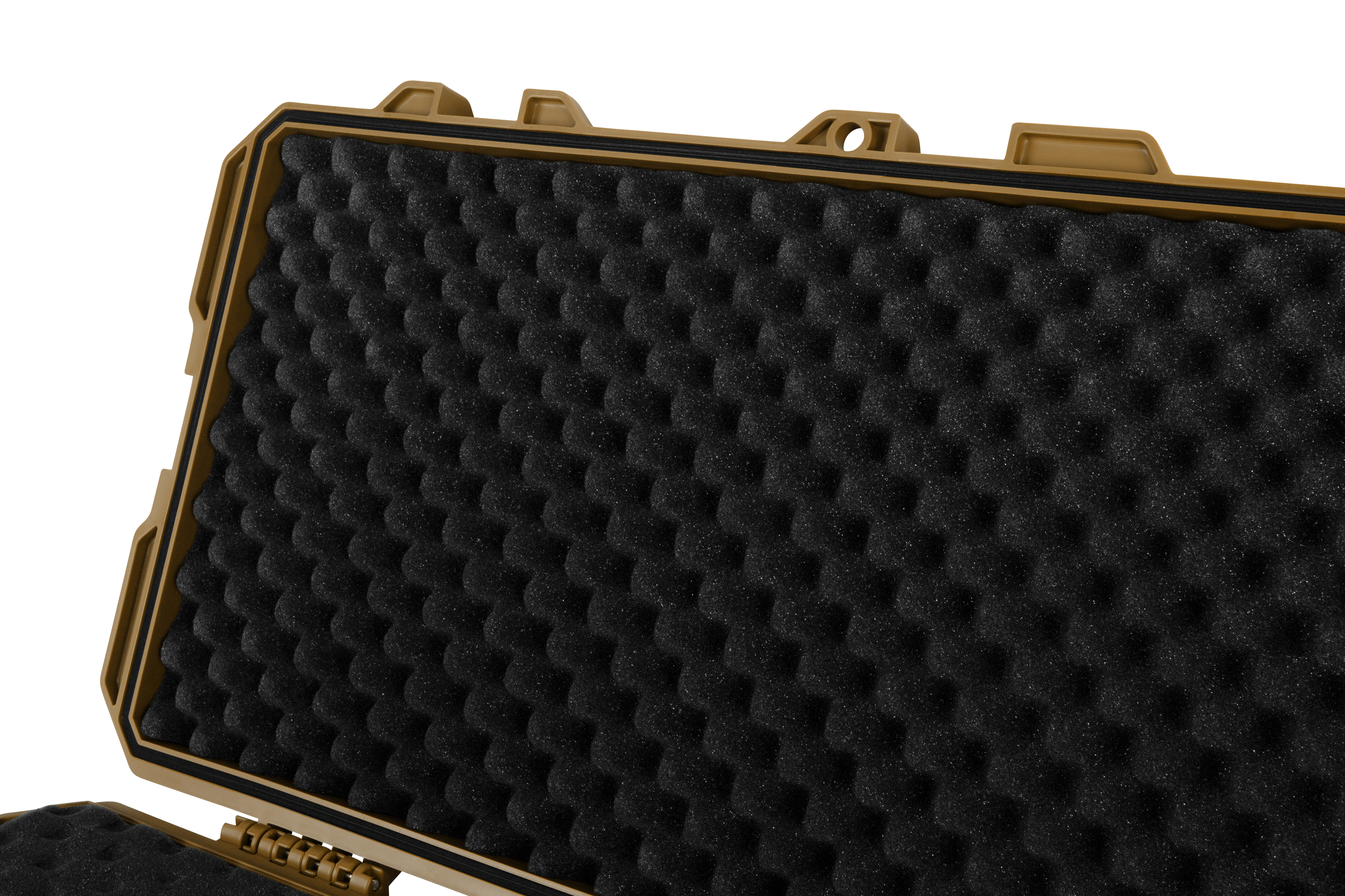 Im Inneren befindet sich ein weiches Schaumstoffinlay. Auf der Oberseite im Eggshell-Design und in der Unterseite ein Pick-n-Plug-Design. Bei letzterem können die vorgeritzen kleinen Quadrate einfach entnommen werden um den Koffer perfekt an die jeweiligen Bedürfnisse anzupassen. Die zwei durchgehenden Löcher an beiden Enden ermöglichen die sichere Abriegelung mit einem Schloss, Kabelbindern etc.