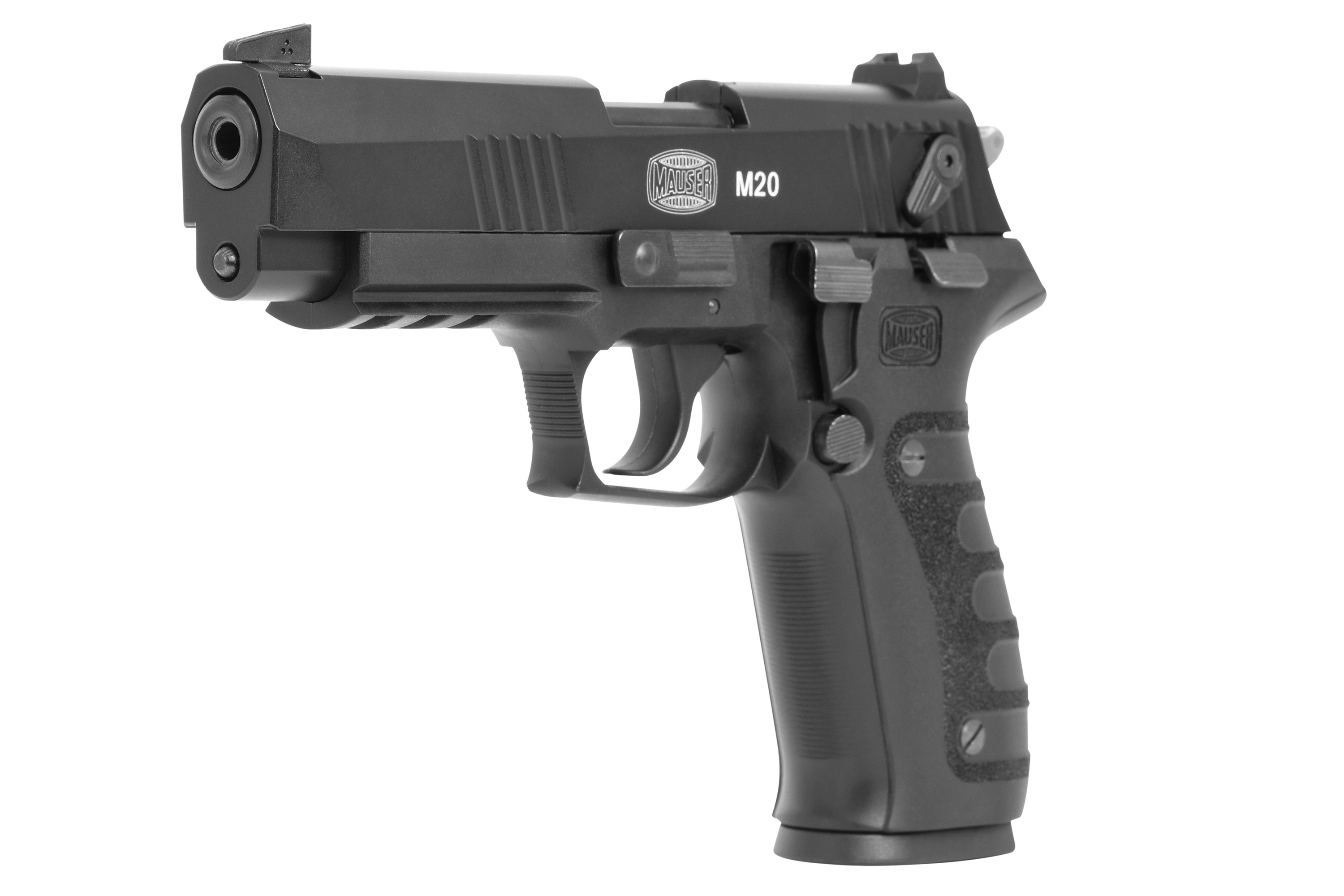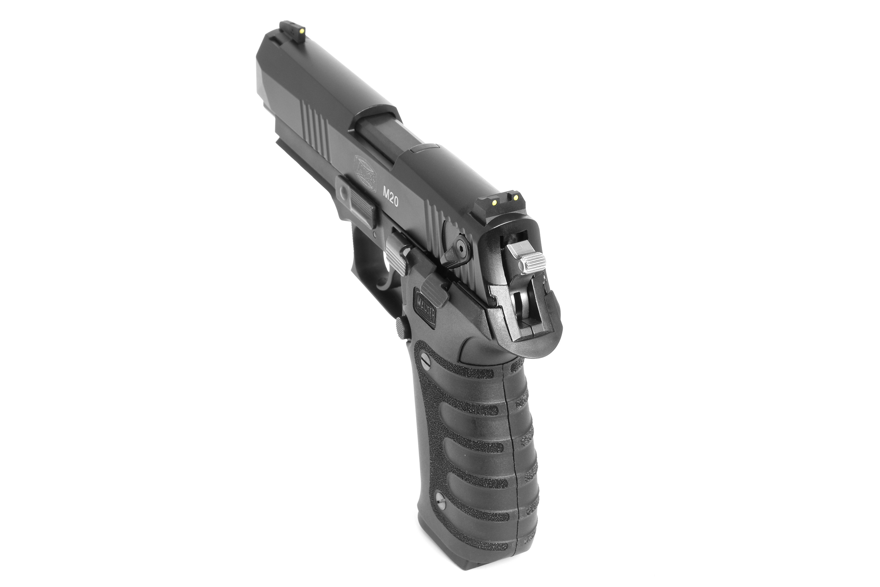 Die Mauser M20 verfügt über einen CNC gefrästen Aluminiumschlitten und ermöglicht somit den Einsatz auch schwächer geladener Standard-Munition bis hin zu HV Munition und deckt somit die ganze Bandbreite der unterschiedlichen Laborierungen ab. Ausgestattet mit einem ergonomischen Polymer Griffstück und schwarzen Kunststoff Griffschalen, Single – und Double-Action Abzug, Picatinny-Schiene zur Anbringung einer Brückenmontage, Metallmagazin, beidseitiger Flügelsicherung, Entspannhebel und einstellbarer Visierung.