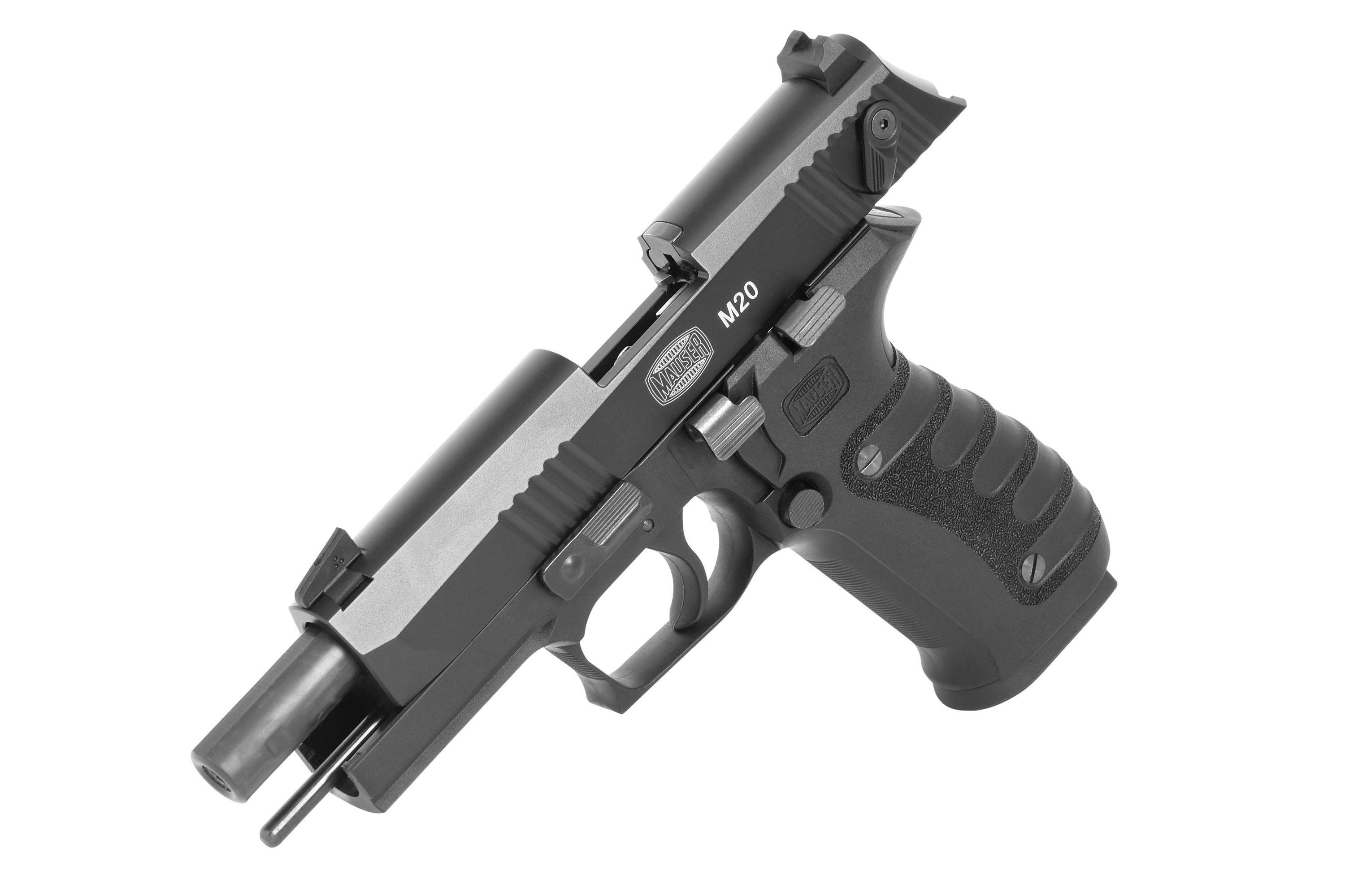 Die Mauser M20 ist eine um 10% verkleinerte Selbstladepistole im Design einer SIG SAUER P226 im Kaliber .22lr mit gleichem System und gleichen Sicherheitsfunktionen. Lediglich im Verschluss unterscheidet Sie sich vom großen Bruder, hier arbeitet ein Masseverschluss (Blowback-System).