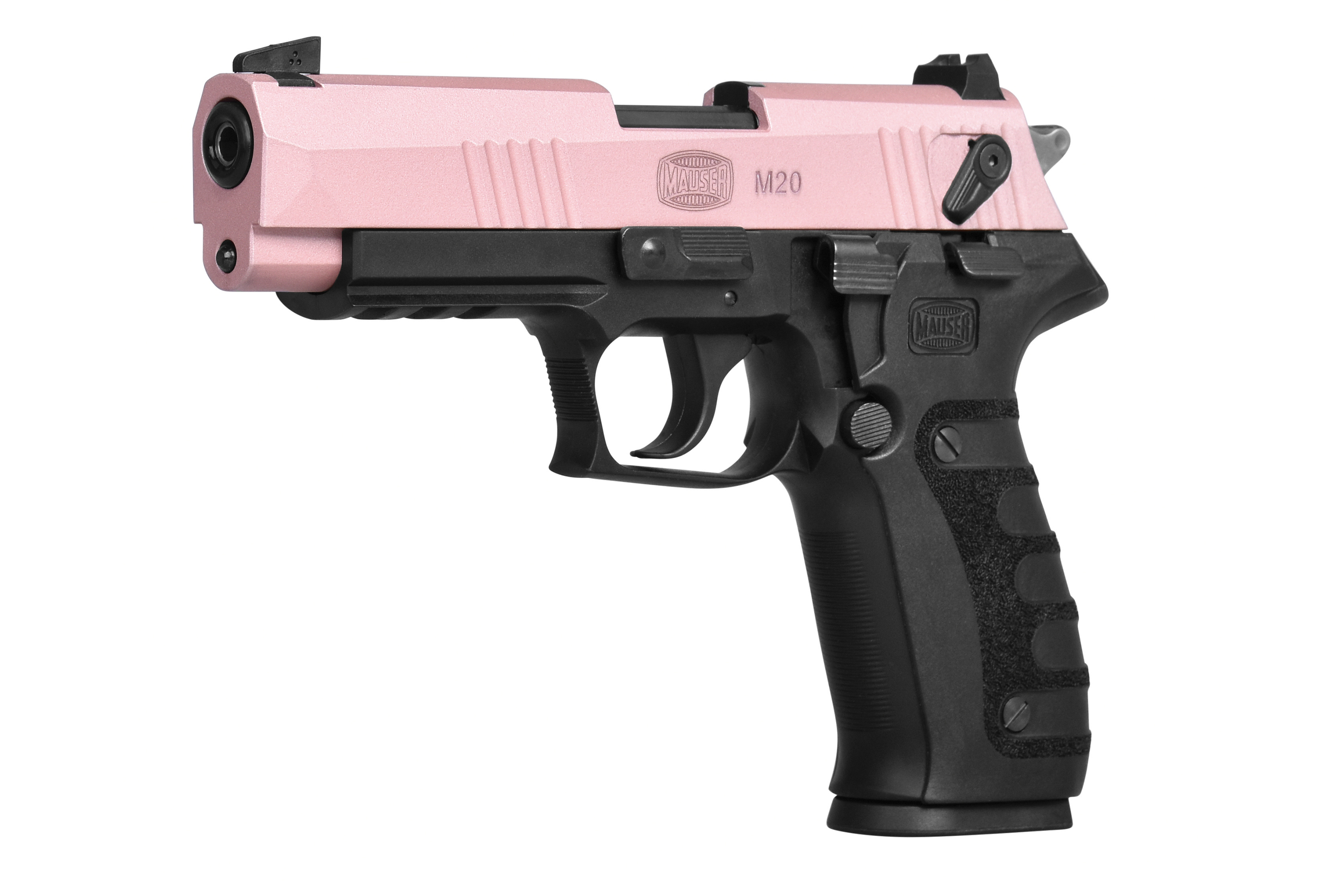 Die Mauser M20 verfügt über einen CNC gefrästen Aluminiumschlitten und ermöglicht somit den Einsatz auch schwächer geladener Standard-Munition bis hin zu HV Munition und deckt somit die ganze Bandbreite der unterschiedlichen Laborierungen ab. Ausgestattet mit einem ergonomischen Polymer Griffstück und schwarzen Kunststoff Griffschalen, Single – und Double-Action Abzug, Picatinny-Schiene zur Anbringung einer Brückenmontage, Metallmagazin, beidseitiger Flügelsicherung, Entspannhebel und einstellbarer Visierung.