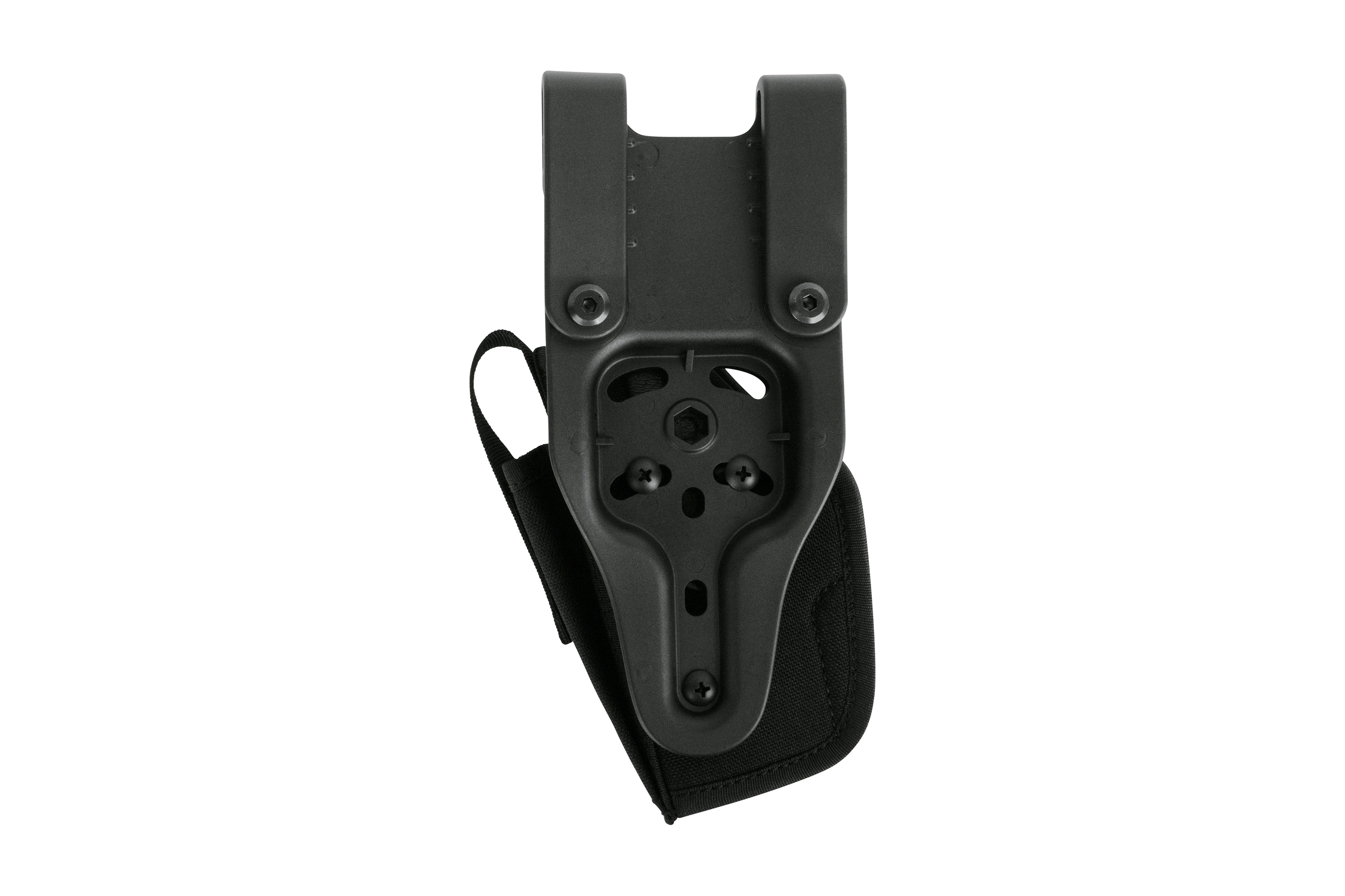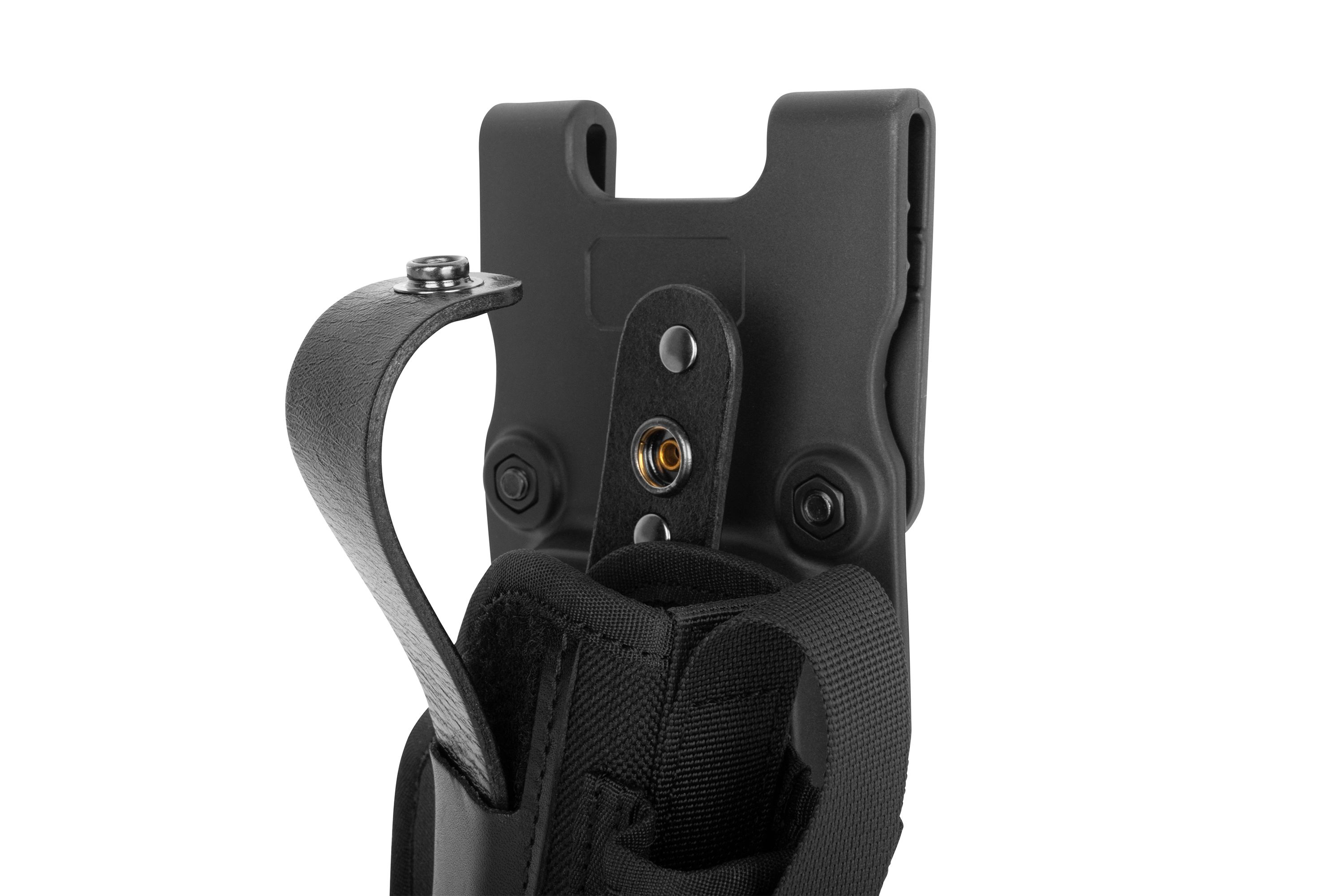 Gürtelholster für die PIEXON JPX 2 Gen 2 Modelle, inklusive einer zusätzlichen Magazintasche aus verstärktem Cordura. Die Sicherung erfolgt durch eine verstellbare Lederschlaufe, die mit einem Druckknopf gesichert wird. Der Neigungswinkel zur Kunststoff-Halteplatte kann individuell angepasst werden.