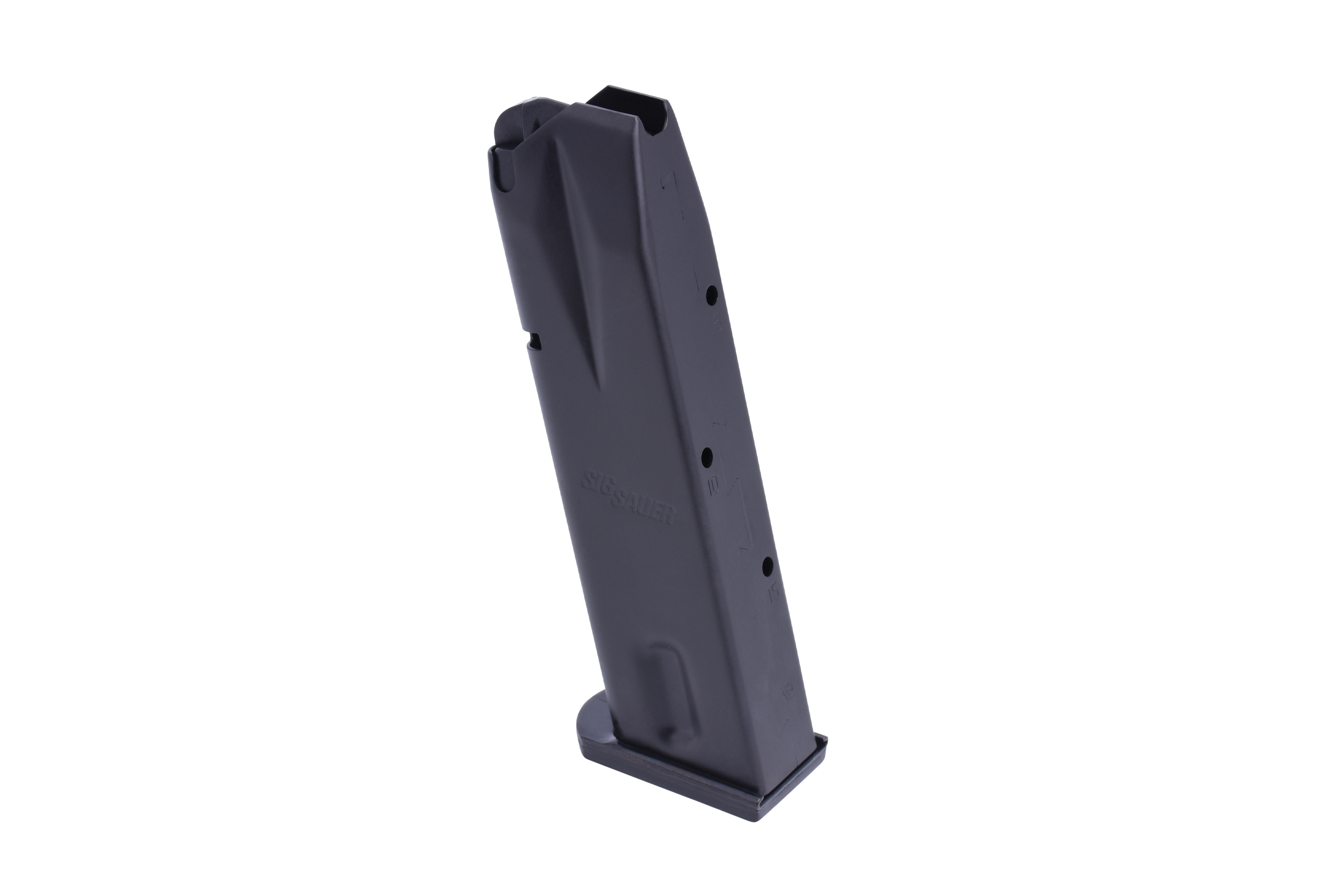 Magazin für die Sig Sauer P226 im Kaliber 9mm Luger mit 15 Schuss, phosphatiertem Magazinkörper und gummiertem Boden.
