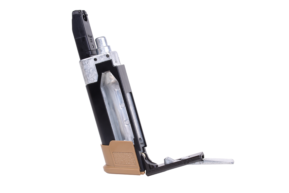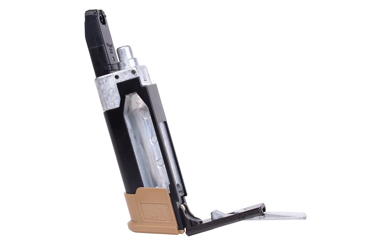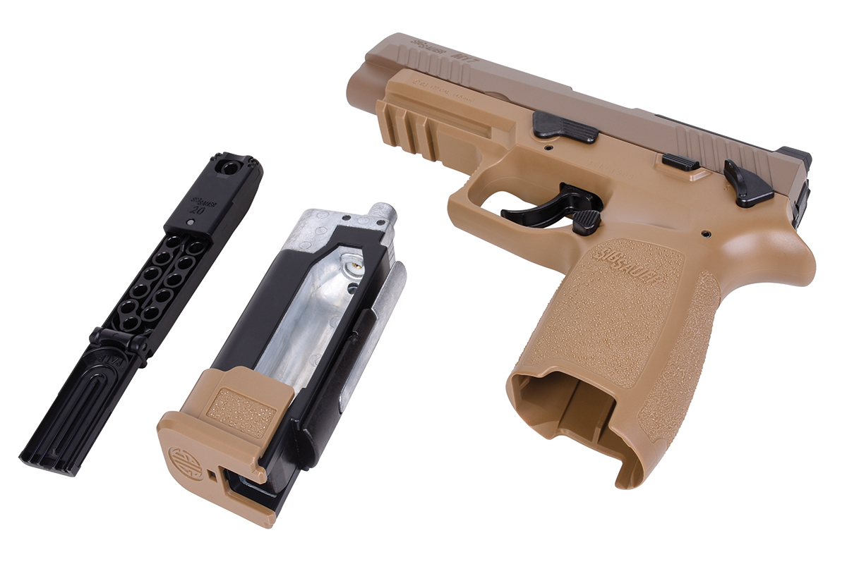 Der Nachbau aus dem Hause Sig Sauer besteht aus hochwertigem Kunststoff sowie einem Metallschlitten und verfügt über ein innovatives 20 Schuss RPM Ketten-Magazin, welches gleichzeitig mit der Co2-Kapsel im Griffstück Platz findet. Der Anstich der Kapsel erfolgt durch eine Hebelmechanik denkbar einfach ohne weiteres Werkzeug.