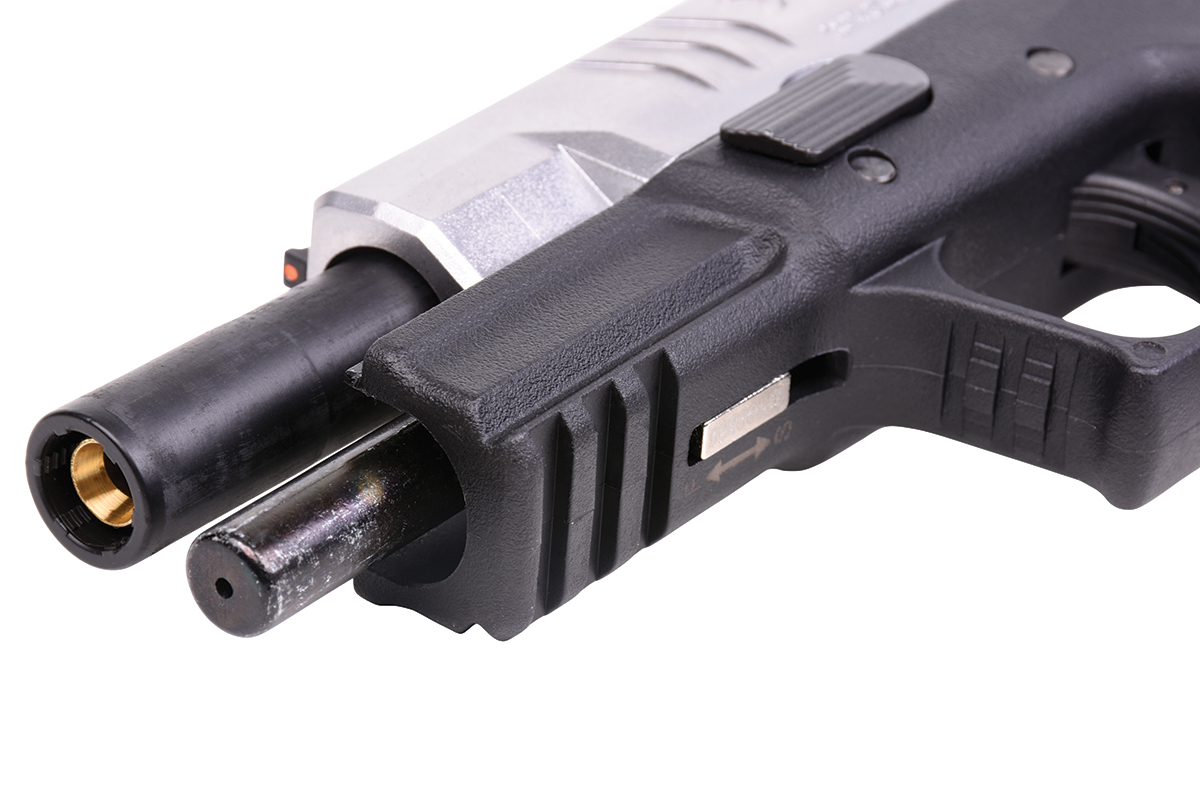 Die hochwertige lizensierte Replika aus dem Hause WE besteht wie das Original aus einem Polymerrahmen und einem Metallschlitten. Die Lieferung erfolgt inklusive drei wechselbaren Griffeinsätzen, um die Waffe optimal an die Hand des Schützen anzupassen. Weiterhin verfügt das Modell über eine Handballensicherung, eine Fiberglas-Visierung, eine Picatinny-Schiene und eine Abzugssicherung. Die Waffe kann einfach zerlegt werden und das BlowBack-System bietet ein reales Schießerlebnis.