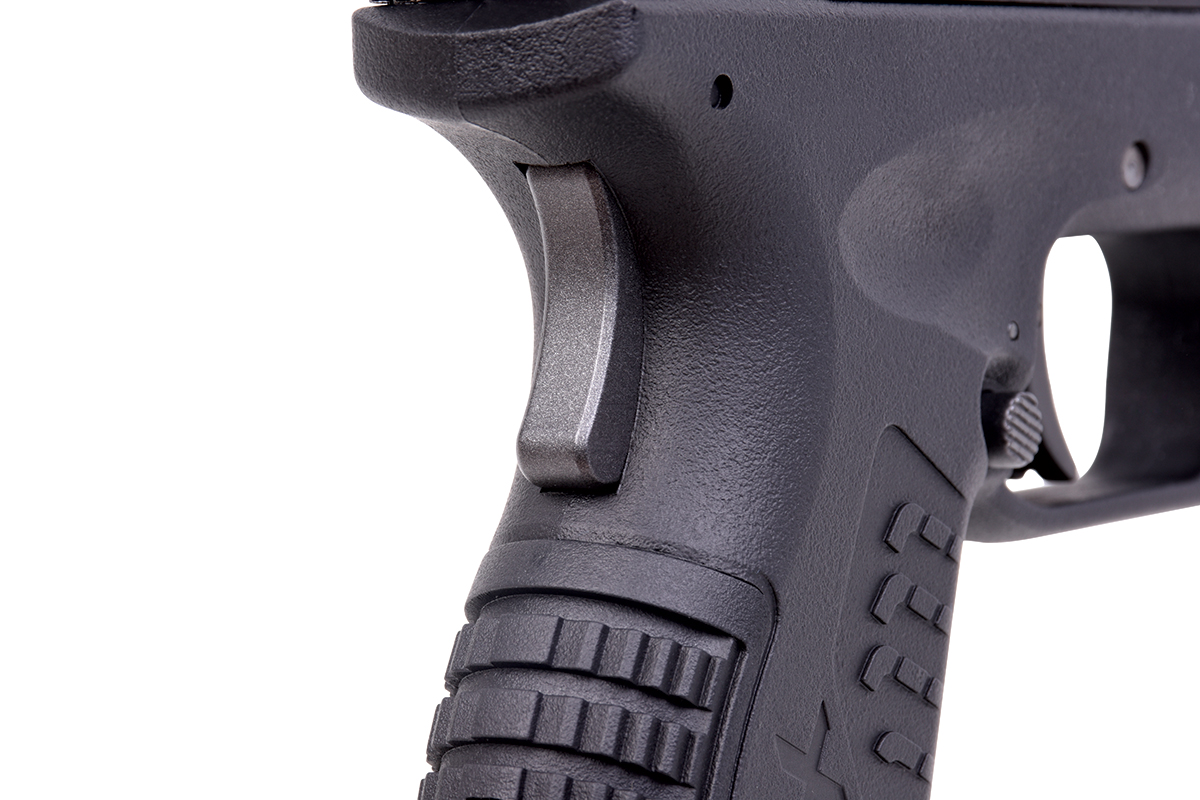 Die hochwertige lizensierte Replika aus dem Hause WE besteht wie das Original aus einem Polymerrahmen und einem Metallschlitten. Die Lieferung erfolgt inklusive drei wechselbaren Griffeinsätzen, um die Waffe optimal an die Hand des Schützen anzupassen. Weiterhin verfügt das Modell über eine Handballensicherung, eine Fiberglas-Visierung, eine Picatinny-Schiene und eine Abzugssicherung. Das einstellbare Spin-Up System sorgt für die nötige Präzision. Die Waffe kann einfach zerlegt werden und das BlowBack-System bietet ein reales Schießerlebnis.